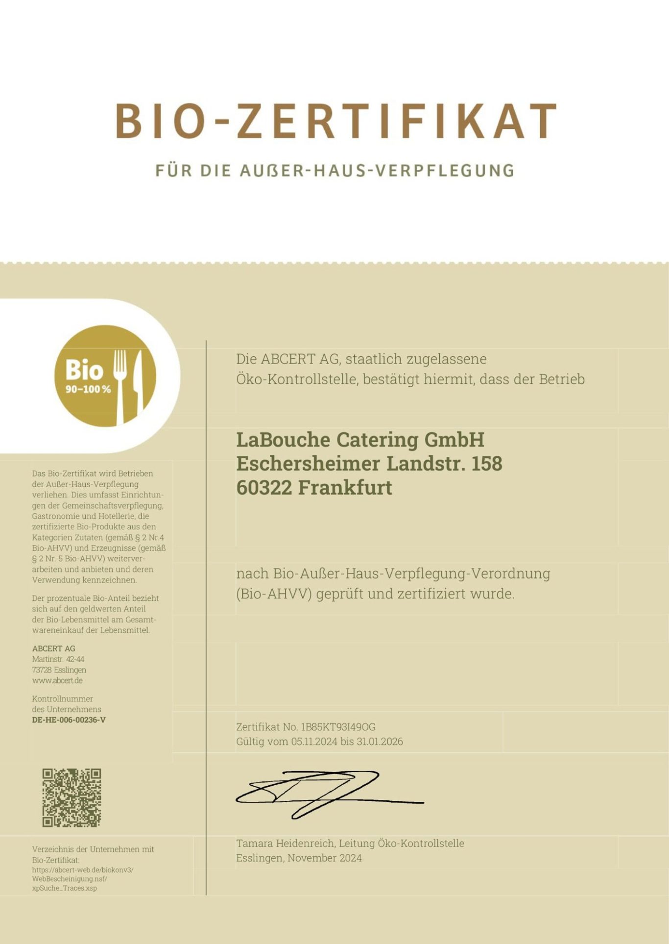 Ja – La Bouche ist mit dem Gold-Zertifikat für Außer-Haus-Verpflegung ausgezeichnet. Das bedeutet: Wir kochen mit Zutaten in höchster Bio-Qualität, geprüft und zertifiziert von der staatlich zugelassenen Öko-Kontrollstelle ABCERT AG. Die Gold-Auszeichnung steht für einen besonders konsequenten Einsatz von Bio-Produkten, deren Herkunft wir transparent kennzeichnen – von der regionalen Bio-Möhre bis zur nachhaltigen Verpackung. Für Sie heißt das: gesunde Ernährung mit Verantwortung – im Alltag, im Team oder in der Kita.